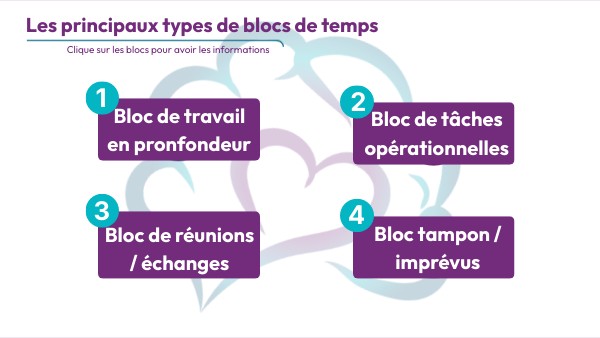 • les regrouper, • leur attribuer des blocs dédiés, • éviter de les traiter en continu toute la journée. Message clé (a afficher dessous): Ce n’est pas la tâche récurrente qui fatigue, c’est sa dispersion.
