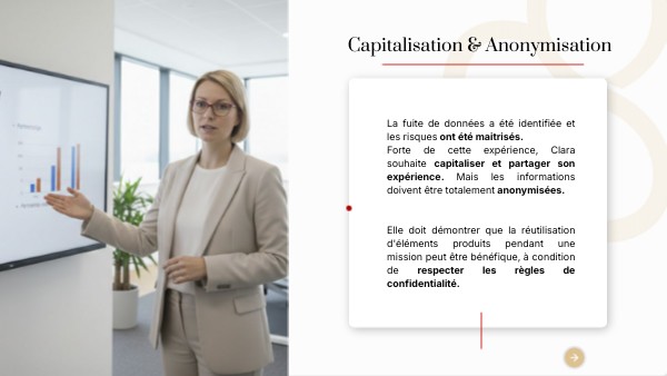 La fuite de données a été identifiée et les risques ont été maitrisés. Forte de cette expérience, Clara souhaite capitaliser et partager son expérience. Mais les informations doivent être totalement anonymisées. Elle doit démontrer que la réutilisation d'éléments produits pendant une mission peut être bénéfique, à condition de respecter les règles de confidentialité.