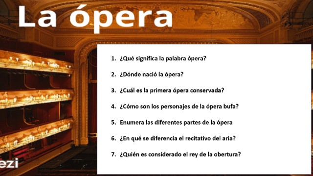 - Enumera las diferentes partes de la ópera: OBERTURA, RECITATIVO, ARIA, CORO E INTERLUDIO