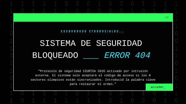 "Protocolo de seguridad IZURTZA 2026 activado por intrusión externa. El sistema solo aceptará el código de acceso si los 8 sectores olímpicos están sincronizados. Introducid la palabra clave para restaurar el orden."