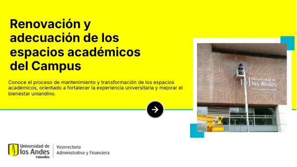 Conoce el proceso de mantenimiento y transformación de los espacios académicos, orientado a fortalecer la experiencia universitaria y mejorar el bienestar uniandino.