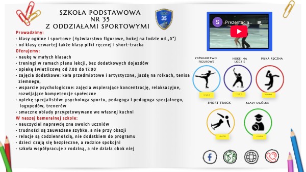 Prowadzimy: • klasy ogólne i sportowe ( łyżwiarstwo figurowe, hokej na lodzie od „0”) • od klasy czwartej także klasy piłki ręcznej i short-tracka Oferujemy: • naukę w małych klasach • treningi w ramach planu lekcji, bez dodatkowych dojazdów • opiekę świetlicową od 7.00 do 17.00 • zajęcia dodatkowe: koła przedmiotowe i artystyczne, jazdę na rolkach, tenisa ziemnego, • wsparcie psychologiczne: zajęcia wspierające koncentrację, relaksacyjne, rozwijające kompetencje społeczne • opiekę specjalistów: psychologa sportu, pedagoga i pedagoga specjalnego, logopedów, trenerów • smaczne obiady przygotowywane we własnej kuchni W naszej kameralnej szkole: • nauczyciel naprawdę zna swoich uczniów • trudności są zauważane szybko, a nie przy okazji • relacje są codziennością, nie dodatkiem do programu • dzieci czują się bezpieczne, a rodzice spokojni • szkoła współpracuje z rodziną, a nie działa obok niej