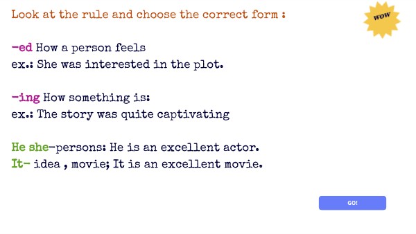Look at the rule and choose the correct form : -ed How a person feels ex.: She was interested in the plot. -ing How something is: ex.: The story was quite captivating He she-persons: He is an excellent actor. It- idea , movie; It is an excellent movie.