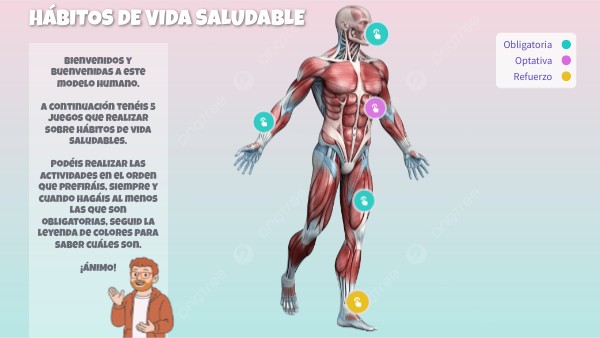 Bienvenidos y buenvenidas a este modelo humano. A continuación tenéis 5 juegos que realizar sobre hábitos de vida saludables. Podéis realizar las actividades en el orden que prefiráis, siempre y cuando hagáis al menos las que son obligatorias, seguid la leyenda de colores para saber cuáles son. ¡ÁNIMO!