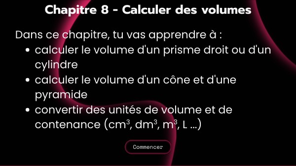 Bienvenue dans ton parcours de validation du chapitre 8 - Calculer des volumes