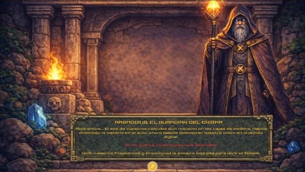 "¡Excelente! La palabra MATES ha hecho vibrar los cimientos del Templo. Habéis superado el primer juicio, pero no bajéis la guardia: esto es solo el comienzo de vuestra intrépida aventura. Si deseáis el título de Verdaderos Matemaníacos, deberéis resistir hasta el final y desentrañar el misterio que ocultan estos muros. ¡Adelante! Vuestro destino os espera."