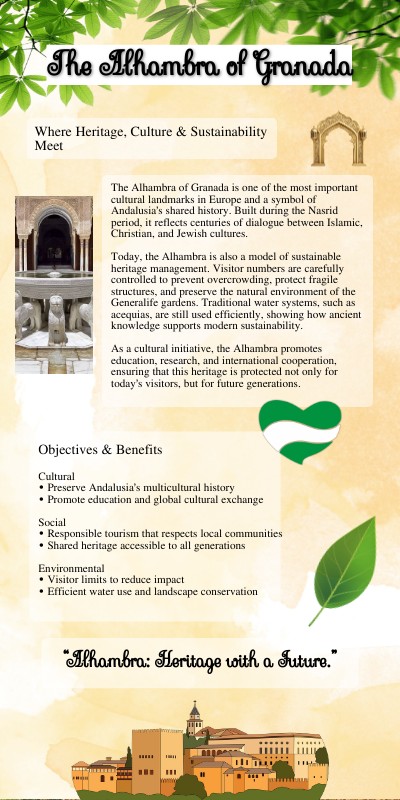 The Alhambra of Granada is one of the most important cultural landmarks in Europe and a symbol of Andalusia’s shared history. Built during the Nasrid period, it reflects centuries of dialogue between Islamic, Christian, and Jewish cultures. Today, the Alhambra is also a model of sustainable heritage management. Visitor numbers are carefully controlled to prevent overcrowding, protect fragile structures, and preserve the natural environment of the Generalife gardens. Traditional water systems, such as acequias, are still used efficiently, showing how ancient knowledge supports modern sustainability. As a cultural initiative, the Alhambra promotes education, research, and international cooperation, ensuring that this heritage is protected not only for today’s visitors, but for future generations.
