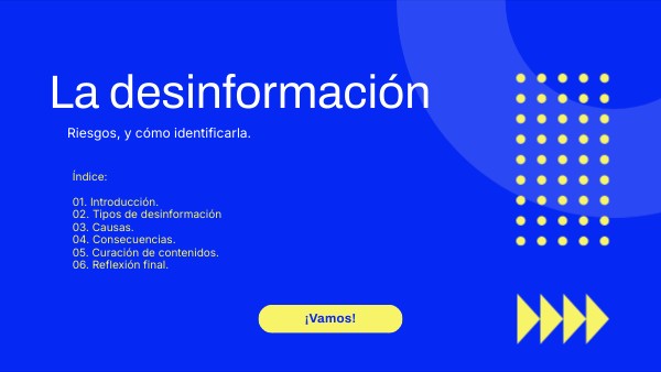 Índice: 01. Introducción. 02. Tipos de desinformación 03. Causas. 04. Consecuencias. 05. Curación de contenidos. 06. Reflexión final.