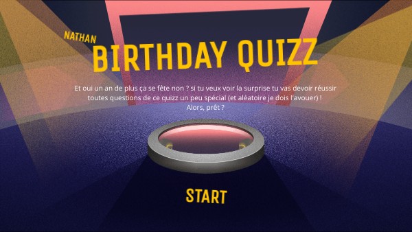 Et oui un an de plus ça se fête non ? si tu veux voir la surprise tu vas devoir réussir toutes questions de ce quizz un peu spécial (et aléatoire je dois l'avouer) ! Alors, prêt ?
