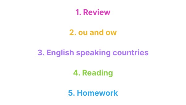 1. Review 2. ou and ow 3. English speaking countries 4. Reading 5. Homework
