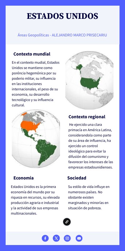 En el contexto mudial, Estados Unidos se mantiene como poréncia hegemónica por su poderio mlitar, su influencia en las instituciones internacionales, el peso de su economia, su desarrollo tecnológico y su influencia cultural.