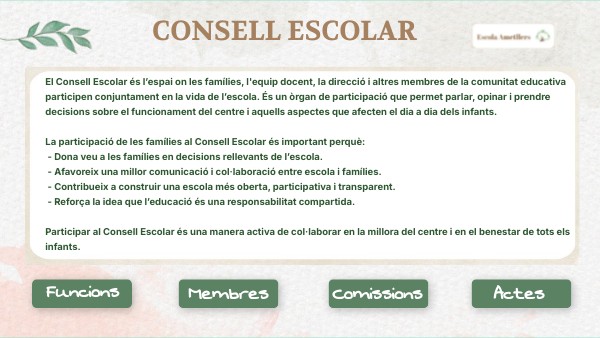 El Consell Escolar és l’espai on les famílies, l'equip docent, la direcció i altres membres de la comunitat educativa participen conjuntament en la vida de l’escola. És un òrgan de participació que permet parlar, opinar i prendre decisions sobre el funcionament del centre i aquells aspectes que afecten el dia a dia dels infants. La participació de les famílies al Consell Escolar és important perquè: - Dona veu a les famílies en decisions rellevants de l’escola. - Afavoreix una millor comunicació i col·laboració entre escola i famílies. - Contribueix a construir una escola més oberta, participativa i transparent. - Reforça la idea que l’educació és una responsabilitat compartida. Participar al Consell Escolar és una manera activa de col·laborar en la millora del centre i en el benestar de tots els infants.