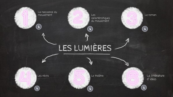 - Métaphore de la raison, de l'intelligence et de l'esprit critique - Opposition à l'obscurentisme - Développement entre 1715 et 1789 - Elaboré par Montesquieu, Buffon, d'Alembert, Voltaire et Diderot - Diffusion de l'encyclopédie de 1751 à 1772 - Cela aboutit à la Déclaration des droits de l'homme et du citoyen en 1789 - La séparation des pouvoirs inspire la rédaction de la Constitution Française