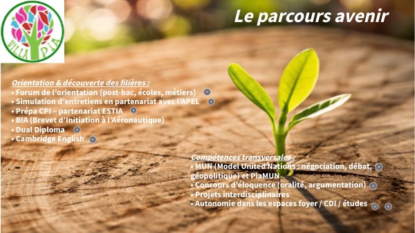 Orientation & découverte des filières :• Forum de l’orientation (post-bac, écoles, métiers) • Simulation d’entretiens en partenariat avec l’APEL • Prépa CPI – partenariat ESTIA • BIA (Brevet d’Initiation à l’Aéronautique) • Dual Diploma • Cambridge English