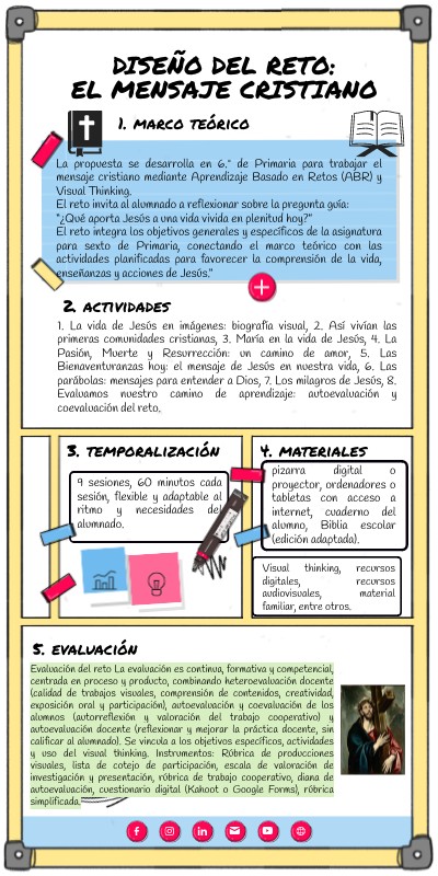 La propuesta se desarrolla en 6.º de Primaria para trabajar el mensaje cristiano mediante Aprendizaje Basado en Retos (ABR) y Visual Thinking. El reto invita al alumnado a reflexionar sobre la pregunta guía: “¿Qué aporta Jesús a una vida vivida en plenitud hoy?”El reto integra los objetivos generales y específicos de la asignatura para sexto de Primaria, conectando el marco teórico con las actividades planificadas para favorecer la comprensión de la vida, enseñanzas y acciones de Jesús."