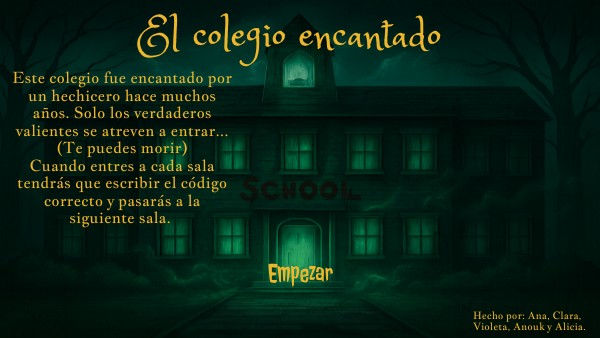 Este colegio fue encantado por un hechicero hace muchos años. Solo los verdaderos valientes se atreven a entrar...(Te puedes morir) Cuando entres a cada sala tendrás que escribir el código correcto y pasarás a la siguiente sala.