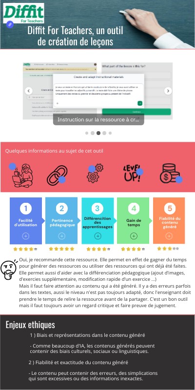 Oui, je recommande cette ressource. Elle permet en effet de gagner du temps pour générer des ressources ou utiliser des ressources qui ont déjà été faites. Elle permet aussi d'aider avec la différenciation pédagogique (ajout d'images, d'exercies supplémentaire, modification rapide d'un exercice ...)Mais il faut faire attention au contenu qui a été généré. Il y a des erreurs parfois dans les textes, aussi le niveau n'est pas toujours adapté, donc l'enseignant doit prendre le temps de relire la ressource avant de la partager. C'est un bon outil mais il faut toujours avoir un regard critique et faire preuve de jugement.