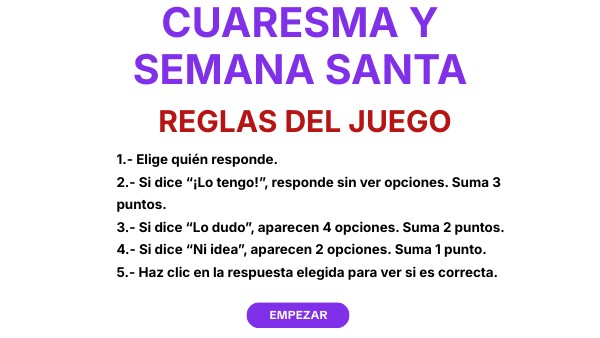 1.- Elige quién responde. 2.- Si dice “¡Lo tengo!”, responde sin ver opciones. Suma 3 puntos. 3.- Si dice “Lo dudo”, aparecen 4 opciones. Suma 2 puntos. 4.- Si dice “Ni idea”, aparecen 2 opciones. Suma 1 punto. 5.- Haz clic en la respuesta elegida para ver si es correcta.