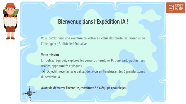 Vous partez pour une aventure collective au cœur des territoires inconnus de l’Intelligence Artificielle Générative. Votre mission : En petites équipes, explorez les zones du territoire IA pour cartographier ses usages, opportunités et risques. 🎯 Objectif : récolter les 6 balises de savoir en franchissant les 6 grandes zones du territoire IA. Avant de démarrer l'aventure, constituez 2 à 4 équipes pour le jeu