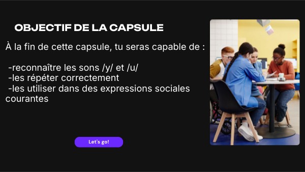 À la fin de cette capsule, tu seras capable de : -reconnaître les sons /y/ et /u/ -les répéter correctement -les utiliser dans des expressions sociales courantes
