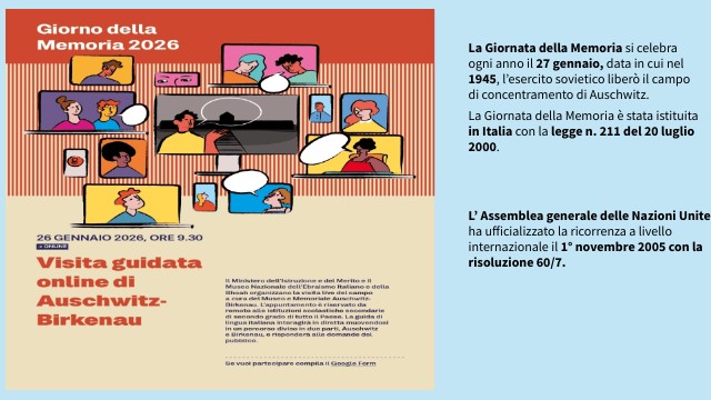 La Giornata della Memoria si celebra ogni anno il 27 gennaio, data in cui nel 1945, l’esercito sovietico liberò il campo di concentramento di Auschwitz. La Giornata della Memoria è stata istituita in Italia con la legge n. 211 del 20 luglio 2000.