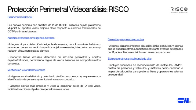 Las nuevas cámaras con analítica de IA de RISCO, lanzadas bajo la plataforma VUpoint AI, aportan varias mejoras clave respecto a sistemas tradicionales de CCTV y cámaras básicas: Analítica avanzada e inteligencia de vídeo • Integran IA para detección inteligente de eventos, no solo movimiento básico: reconocen personas, vehículos y otros objetos relevantes, interpretan escenas y reducen eficazmente falsas alarmas. • Soportan líneas virtuales, detección de intrusión perimetral y objetos dejados/retirados, permitiendo reglas de alerta basadas en comportamientos concretos. Verificación y claridad mejoradas • Imágenes en alta definición y color tanto de día como de noche, lo que mejora la identificación de personas y vehículos incluso con poca luz. • Generan alertas más precisas y útiles al combinar datos de IA con video, facilitando acciones rápidas de operadores o usuarios.