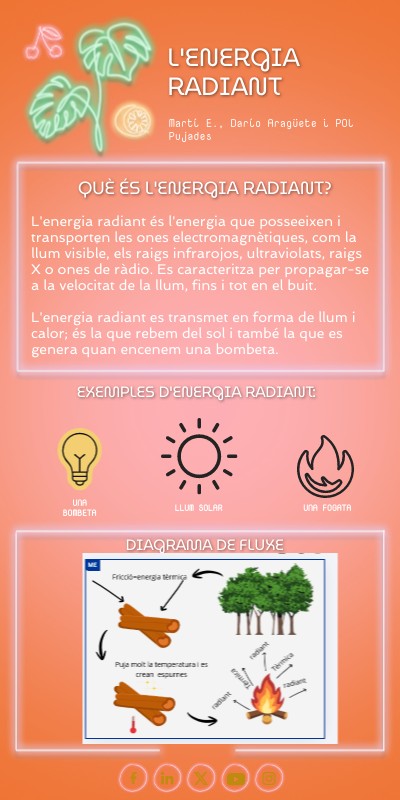 L'energia radiant és l'energia que posseeixen i transporten les ones electromagnètiques, com la llum visible, els raigs infrarojos, ultraviolats, raigs X o ones de ràdio. Es caracteritza per propagar-se a la velocitat de la llum, fins i tot en el buit. L'energia radiant es transmet en forma de llum i calor; és la que rebem del sol i també la que es genera quan encenem una bombeta.