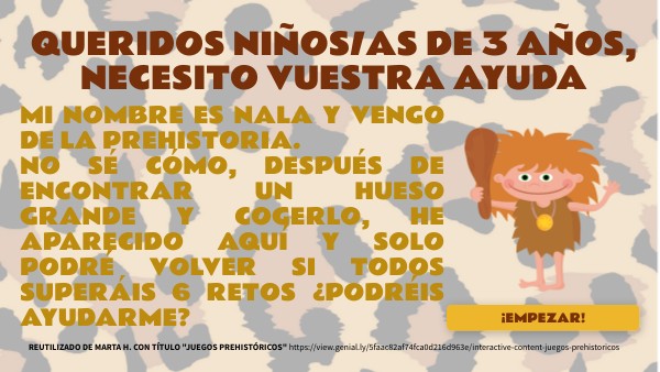 MI NOMBRE ES NALA Y VENGO DE LA PREHISTORIA. NO SÉ CÓMO, DESPUÉS DE ENCONTRAR UN HUESO GRANDE Y COGERLO, HE APARECIDO AQUÍ Y SOLO PODRÉ VOLVER SI TODOS SUPERÁIS 6 RETOS ¿PODRÉIS AYUDARME?