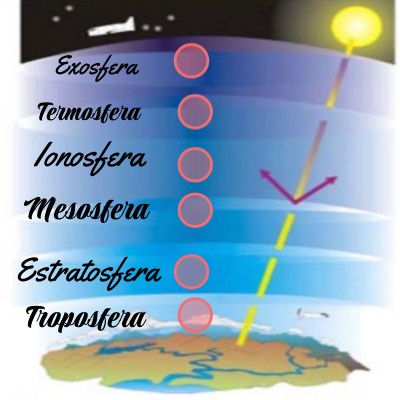 .extensió:desde los 50-60 km hasta más de 1000 km de altitud Temperatura:varía enormemente con la altitud y la hora del día, aumentando drásticamente por la radiación solar, pudiendo alcanzar más de 1.000 °C (incluso hasta 1.500 °C o 2.000 °C) en las capas superiores durante el día, aunque en realidad se percibe fría debido a la baja densidad de partículas; por la noche puede descender a unos 300 °C. Fenómens:ondas de radio, y perturbaciones por tormentas solares o sismos