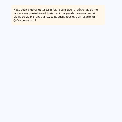 Hello Lucie ! Merci toutes les infos. je sens que j'ai très envie de me lancer dans une teinture ! Justement ma grand-mère m'a donné pleins de vieux draps blancs. Je pourrais peut-être en recycler un ? Qu'en penses-tu ?