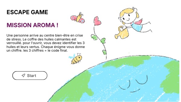 Une personne arrive au centre bien-être en crise de stress. Le coffre des huiles calmantes est verrouillé. pour l'ouvrir, vous devez identifier les 3 huiles et leurs vertus. Chaque énigme vous donne un chiffre. les 3 chiffres = le code final.