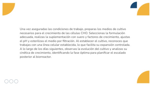 Durante el proceso, compruebas que el vial recuperado del banco celular ha mantenido una viabilidad adecuada tras la descongelación. Este procedimiento te permite aplicar los principios de la criopreservación y valorar su importancia para asegurar la disponibilidad de células a largo plazo. Paralelamente, realizas técnicas de caracterización celular para confirmar la identidad de la línea CHO y descartar alteraciones o contaminaciones, incluyendo los controles de micoplasma exigidos por el departamento de calidad. Con ello, garantizas que el cultivo cumple los criterios necesarios para continuar con la producción.