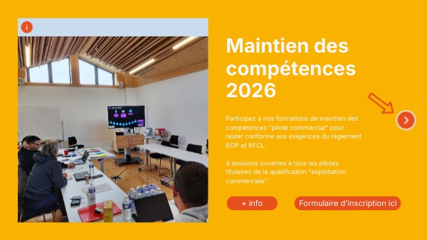 Participez à nos formation de maintien des compétences "pilote commercial" pour rester conforme aux exigences du règlement BOP et BFCL. 4 sessions ouvertes à tous les pilotes titulaires de la qualification "exploitation commerciale".