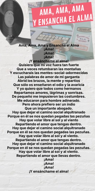 Ama, Ama, Ama y Ensancha el Alma ¡Ama! ¡Ama! ¡Ama! ¡Y ensánchame el alma! Quisiera que mi voz fuera tan fuerte Que a veces retumbaran las montañas Y escucharais las mentes-social-adormecidas Las palabras de amor de mi garganta Abrid los brazos, la mente y repartíos Que sólo os enseñaron el odio y la avaricia Y yo quiero que todos como hermanos Repartamos amores, lágrimas y sonrisas. De pequeño me impusieron las costumbres. Me educaron para hombre adinerado. Pero ahora prefiero ser un indio Que un importante abogado. Hay que dejar el camino social alquitranado Porque en él se nos quedan pegadas las pezuñas Hay que volar libre al sol y al viento Repartiendo el amor que tengas dentro. Hay que dejar el camino social alquitranado Porque en él se nos quedan pegadas las pezuñas. Hay que volar libre al sol y al viento. Repartiendo el amor que tengas dentro. Hay que dejar el camino social alquitranado Porque en él se nos quedan pegadas las pezuñas. Hay que volar libre al sol y al viento. Repartiendo el amor que llevas dentro. ¡Ama! ¡Ama! ¡Ama! ¡Y ensánchame el alma!