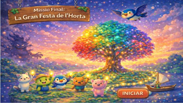 Ei, colla! Les llavors que hem cuidat durant totes les missions han fet créixer el Gran Arbre de l’Horta… però encara no hem acabat! Si superem l’últim repte, l’Horta s’omplirà de colors i podrem celebrar la Gran Festa. Esteu preparats per a la missió final?