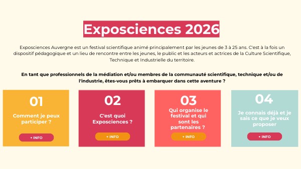Exposciences Auvergne est un festival scientifique animé principalement par les jeunes de 3 à 25 ans. C'est à la fois un dispositif pédagogique et un lieu de rencontre entre les jeunes, le public et les acteurs et actrices de la Culture Scientifique, Technique et Industrielle du territoire.En tant que professionnels de la médiation et/ou membres de la communauté scientifique, technique et/ou de l'industrie, êtes-vous prêts à embarquer dans cette aventure ?