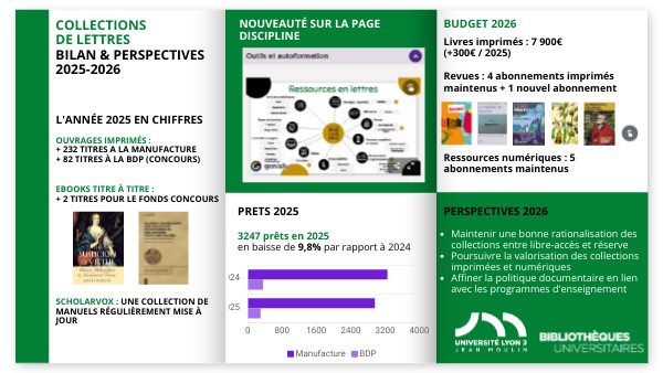 Livres imprimés : 7 900€ (+300€ / 2025) Revues : 4 abonnements imprimés maintenus + 1 nouvel abonnement Ressources numériques : 5 abonnements maintenus