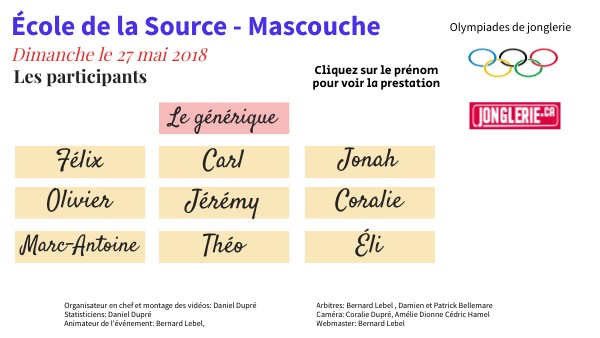 Organisateur en chef et montage des vidéos: Daniel Dupré Statisticiens: Daniel Dupré Animateur de l'événement: Bernard Lebel,