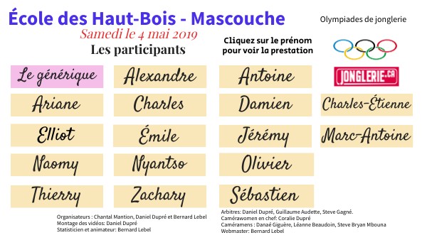 Organisateurs : Chantal Mantion, Daniel Dupré et Bernard Lebel Montage des vidéos: Daniel Dupré Statisticien et animateur: Bernard Lebel