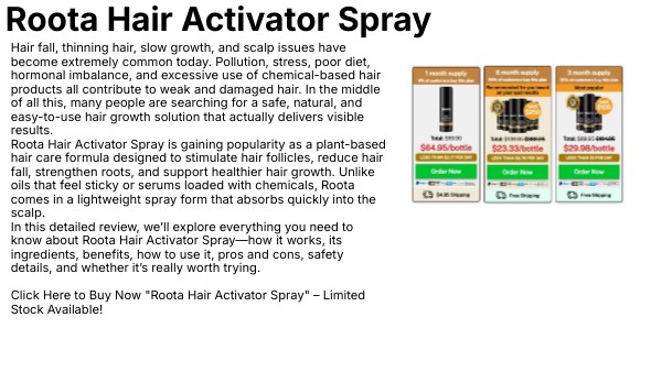 Hair fall, thinning hair, slow growth, and scalp issues have become extremely common today. Pollution, stress, poor diet, hormonal imbalance, and excessive use of chemical-based hair products all contribute to weak and damaged hair. In the middle of all this, many people are searching for a safe, natural, and easy-to-use hair growth solution that actually delivers visible results. Roota Hair Activator Spray is gaining popularity as a plant-based hair care formula designed to stimulate hair follicles, reduce hair fall, strengthen roots, and support healthier hair growth. Unlike oils that feel sticky or serums loaded with chemicals, Roota comes in a lightweight spray form that absorbs quickly into the scalp. In this detailed review, we’ll explore everything you need to know about Roota Hair Activator Spray—how it works, its ingredients, benefits, how to use it, pros and cons, safety details, and whether it’s really worth trying. Click Here to Buy Now "Roota Hair Activator Spray" – Limited Stock Available!