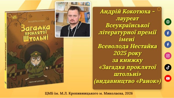 Андрій Кокотюха - лауреат Всеукраїнської літературної премії імені Всеволода Нестайка 2025 року за книжку «Загадка проклятої штольні» (видавництво «Ранок»)