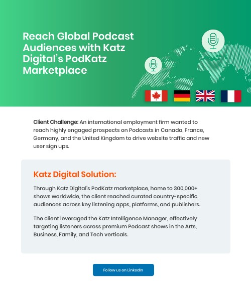 Client Challenge: An international employment firm wanted to reach highly engaged prospects on Podcasts in Canada, France, Germany, and the United Kingdom to drive website traffic and new user sign ups.