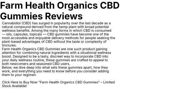 Cannabidiol (CBD) has surged in popularity over the last decade as a natural compound derived from the hemp plant with broad potential wellness benefits. Among the many forms in which CBD is consumed — oils, capsules, topicals — CBD gummies have become one of the most accessible and enjoyable delivery methods for people seeking the plant-based advantages of CBD without the taste or complexity of tinctures. Farm Health Organics CBD Gummies are one such product gaining attention for combining natural ingredients with a situational wellness boost. Designed to be a tasty, discreet way to incorporate CBD into your daily wellness routine, these gummies are crafted to appeal to both newcomers and seasoned CBD users. Below, we dive deep into what sets these gummies apart, how they work, and everything you need to know before you consider adding them to your regimen. Click Here to Buy Now "Farm Health Organics CBD Gummies" – Limited Stock Available!