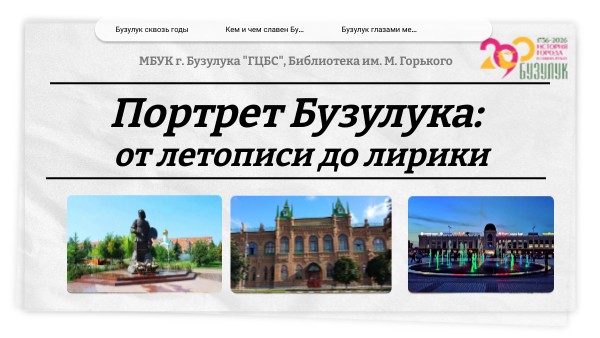 В честь юбилея библиотека им. М. Горького представляет виртуальную выставку книг о нашем городе. Погрузитесь в путешествие сквозь время: узнайте о его истории, выдающихся земляках и неповторимом духе Бузулука. Добро пожаловать в мир традиций родного края!