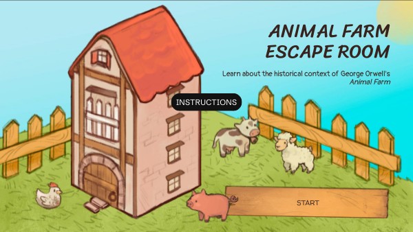 You are stuck inside the farm and can't escape! There are 4 total rooms, with 4 questions in each. In each of these rooms, there are hidden clues to help you find the answer to the questions. Click around to reveal your clues that contain information on the historical context of George Orwell's Animal Farm. Read this article to help you get started. Click START on the home screen to begin