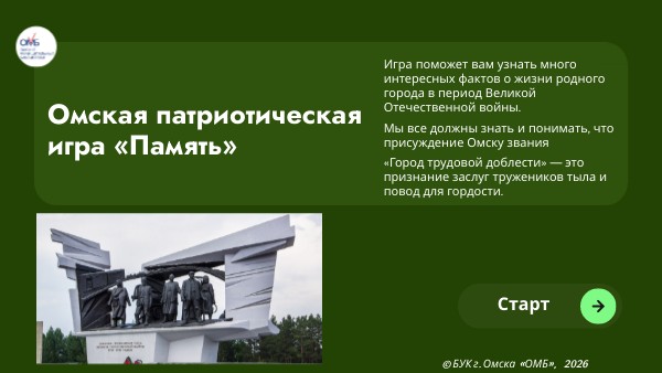 Игра поможет вам узнать много интересных фактов о жизни родного города в период Великой Отечественной войны. Мы все должны знать и понимать, что присуждение Омску звания «Город трудовой доблести» — это признание заслуг тружеников тыла и повод для гордости.