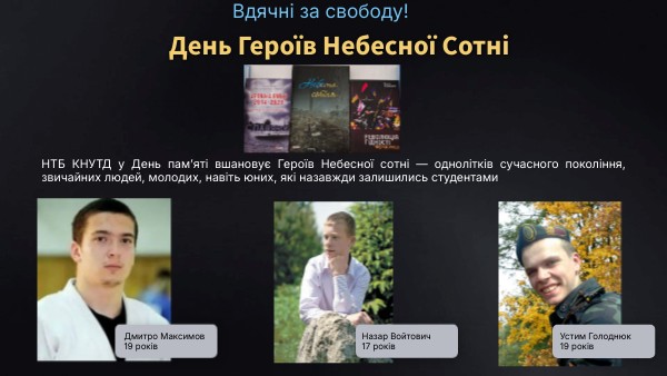 НТБ КНУТД у День пам’яті вшановує Героїв Небесної сотні — однолітків сучасного покоління, звичайних людей, молодих, навіть юних, які назавжди залишились студентами