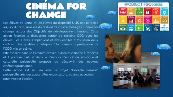 Les élèves de 4ème et les élèves du dispositif ULIS ont participé au jury du prix jeunesse du festival de courts-métrages Cinéma for change, autour des Objectifs de développement durable. Cette action favorise la discussion autour de certains ODD avec les élèves. Les élèves s'impliquent et évaluent les films selon deux critères : les qualités artistiques / la bonne compréhension de l'ODD mis en scène. Elle s'inscrit dans le Parcours citoyen puisqu'elle donne à réfléchir et à prendre part, et dans le Parcours d'éducation artistique et culturelle puisqu'elle propose de découvrir des oeuvres cinématographiques. Cette action est en lien avec le projet "J'invente demain" puisqu'elle crée des passerelles entre culture, science et sociétépour inspirer l’action.