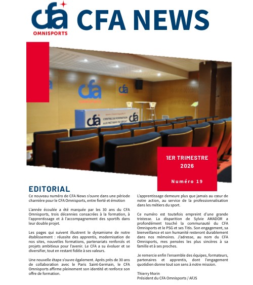 Ce nouveau numéro de CFA News s’ouvre dans une période charnière pour le CFA Omnisports, entre fierté et émotion L’année écoulée a été marquée par les 30 ans du CFA Omnisports, trois décennies consacrées à la formation, à l’apprentissage et à l’accompagnement des sportifs dans leur double projet. Les pages qui suivent illustrent le dynamisme de notre établissement : réussite des apprentis, modernisation de nos sites, nouvelles formations, partenariats renforcés et projets ambitieux pour l’avenir. Le CFA a su évoluer et se diversifier, tout en restant fidèle à ses valeurs. Une nouvelle étape s’ouvre également. Après près de 30 ans de collaboration avec le Paris Saint-Germain, le CFA Omnisports affirme pleinement son identité et renforce son offre de formation.
