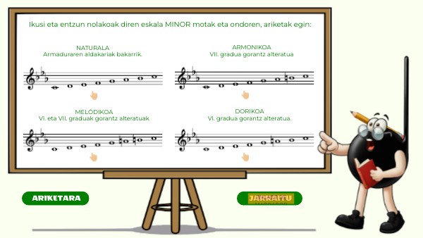 Ikusi eta entzun nolakoak diren eskala MINOR motak eta ondoren, ariketak egin: